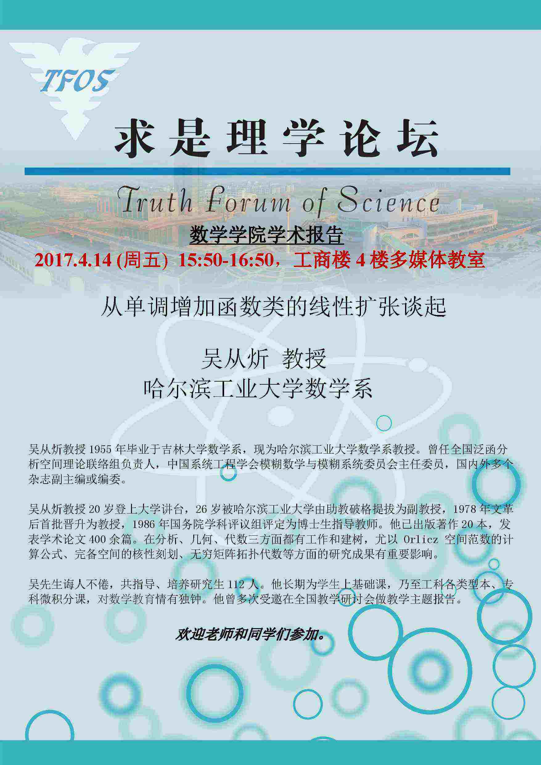 学术科研 学术团队 学术活动 学术会议 学术报告 讨论班 School Colloquium 信息公告 文件汇编 学术报告 米兰网页版 > (4月14日)从单调增加函数类的线性扩张谈起 来源:米兰(中国) 发布时间:2017-04-13 859