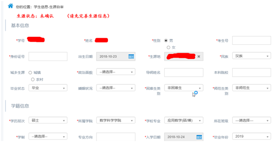 ②信息核对:登录之后,点击左侧的“生源自审”确认自己的信息,信息录入完成后,请务必记得点击右下角的“确认”键。(*号是必填项,信息请尽量填全,保持完整性。)