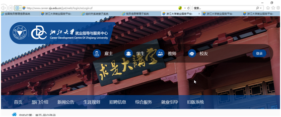 ① 登录:登录浙江大学就业服务平台http://www.career.zju.edu.cn/jyxt/web/login/xsLogin.zf,点击“登录”,选择学生登录,用户名为学号,密码默认123123。登陆后请马上修改密码,并完善信息(登录后右上角有修改密码功能)。如果学生改了密码后反应登录不进去,可联系李萌老师解决。