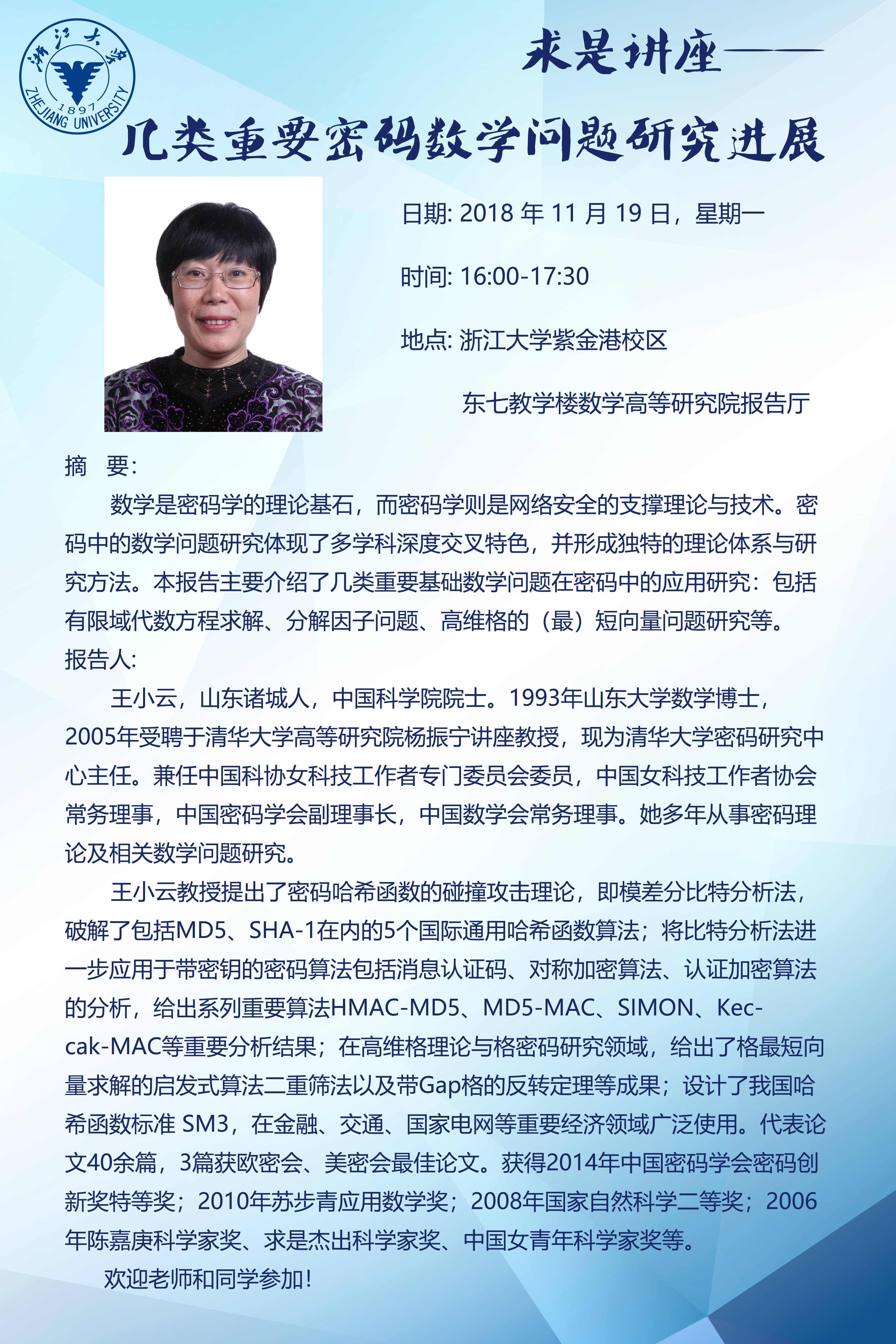 学术科研 学术团队 学术活动 学术会议 学术报告 讨论班 School Colloquium 信息公告 文件汇编 2018 米兰网页版 > 求是讲座――几类重要密码数学问题研究进展 来源:米兰(中国) 发布时间:2018-11-16 716