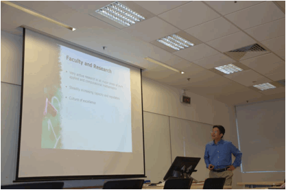 之后,朱成波教授向交流团详细地介绍了新加披国立大学数学系教学、研究的概况,以及数学系的研究生以及博士生项目。紧接着Toh Kim Chuan教授和Wang Dong博士给我们带来了关于凸聚类以及随机矩阵讲座,让我们受益匪浅。