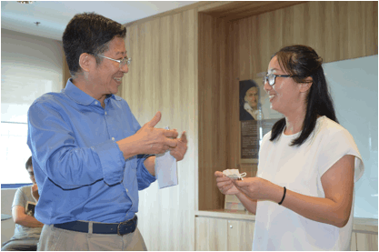 新加披国立大学数学系系主任朱成波教授(也是我院校友),在数学系大楼对我方交流团表示热烈的欢迎,带领我们参观了新加坡国立大学数学系,介绍了这几年来新加坡国立大学数学系的概况。陈卫老师代表学院向朱成波教授赠送了校友纪念章并表示感谢。