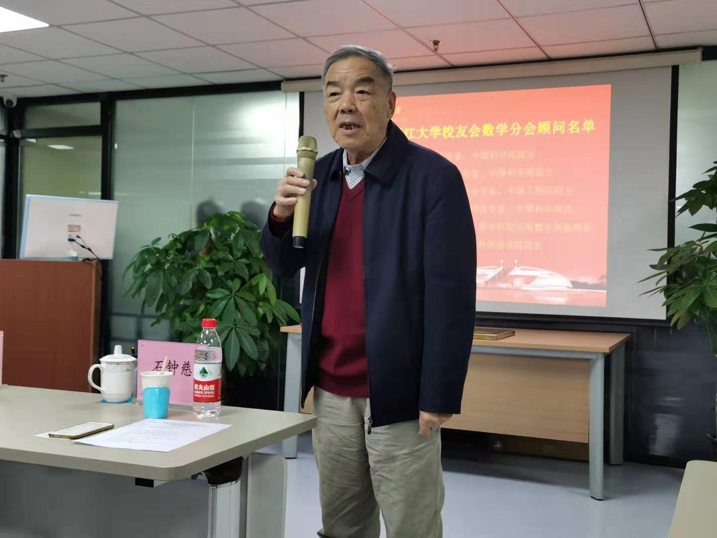 仪式后,石钟慈院士作为顾问代表讲话。他首先祝贺浙大北京校友会数学分会的成立,并讲述了在浙大精神的鼓舞下那些激情燃烧的岁月,尤其是1951年缘起浙大、随同院系调整、师从陈建功先生科研等激动人心的经历,饱含激情地表述了对浙大的热爱。他指出,米兰(中国)作为浙大名片,秉承“求是”精神,人才辈出,必将在创建世界一流学科中获得更大发展。石院士谈了对校友会的认识,对分会的成立给予充分肯定,他期待北京浙大校友会数学分会能够充分发挥纽带作用,加强母校和校友之间的联系。