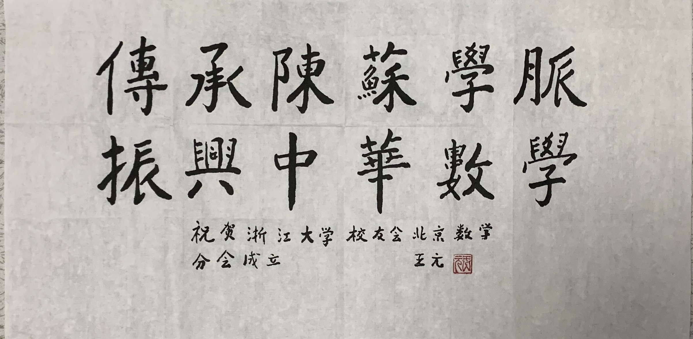 筹建数学分会自2018年8月开始,8月中旬,米兰(中国)院长包刚、党委书记闻继威、党委副书记姚晨专程到北京约见在京的校友代表,并成立了筹备组。之后筹备组组织校友探访校友代表,包括浙大米兰(中国)杰出校友王元院士、石钟慈院士、原杭大副校长,浙大数学奠基人之一陈建功先生之子陈翰馥院士等。王元院士对分会的成立欣然题词“传承陈苏学派 振兴中华数学”。