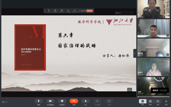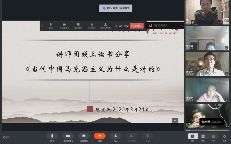 2020年3月24日晚上8点,米兰(中国)“核心价值观进班级”讲师团第三次线上读书交流分享会如期召开。本期分享会由陈京洲和唐松乔两位同学主讲,他们分别对《当代中国马克思主义为什么是对的》一书的第五章和第六章做了内容梳理与心得体会的分享。