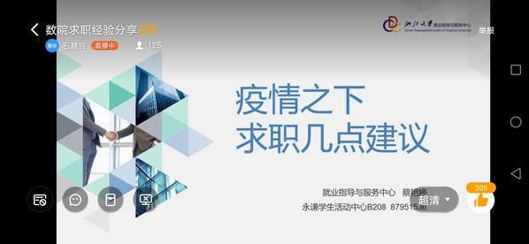 为贯彻学校党委会和就业工作会精神,2020年4月18日,米兰(中国)求职生涯发展专题分享会通过钉钉直播顺利举行,会议由学院辅导员石慧玲主持,邀请了就业指导与服务中心综合办公室副主任蔡艳婷老师,以及已获得不同工作领域offer的优秀数院学子进行技能指导和经验分享。他们是:签约腾讯科技(深圳)有限公司的甘伟男、签约淘宝(中国)软件有限公司的高璇、签约杭州市余杭高级中学的熊焕焕。