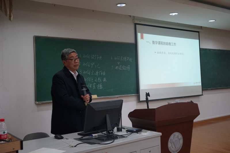 苏德矿老师首先从批改作业方面给各位助教展开培训。老师具体提出了三个问题——如何改作业?如何登记作业?如何点评作业?通过结合自身多年的教学经验,老师给大家进行了详细的指导。苏德矿老师随后给出了如何上好习题课的建议,要先从重要定义和性质开始,再逐步深入到综合性问题,可以适当提高题目难度以更好地激发同学们的学习热情。最后,苏德矿老师提议可以采用直播或者微博的方式来增加助教与学生之间的互动。