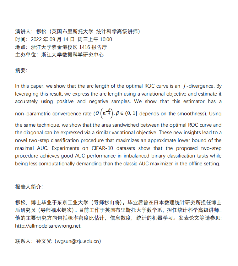 学术科研 学术团队 学术活动 学术会议 学术报告 讨论班 School Colloquium 信息公告 文件汇编 学术报告 米兰网页版 > Estimating the Arc Length of the Optimal ROC Curve and Lower Bounding the Maximal AUC 来源:米兰(中国) 发布时间:2022-09-14 334