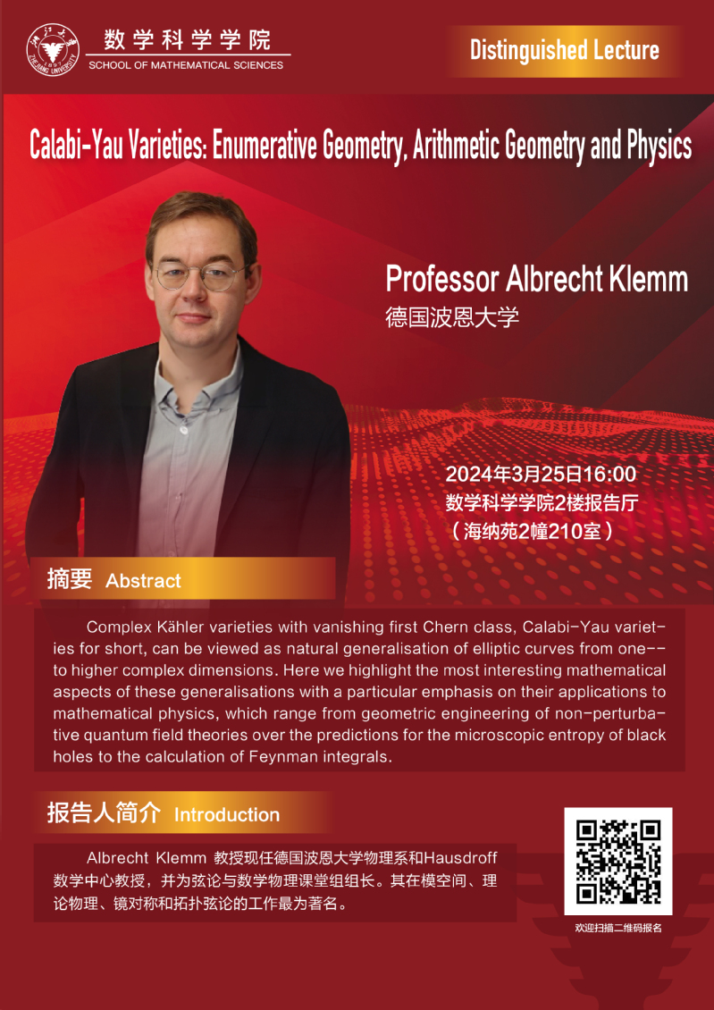 学术科研 学术团队 学术活动 学术会议 学术报告 讨论班 School Colloquium 信息公告 文件汇编 School Colloquium 米兰网页版 > Distinguished Lecture——Calabi-Yau Varieties: Enumerative Geometry, Arithmetic Geometry and Physics 来源:米兰(中国) 发布时间:2024-03-20 370