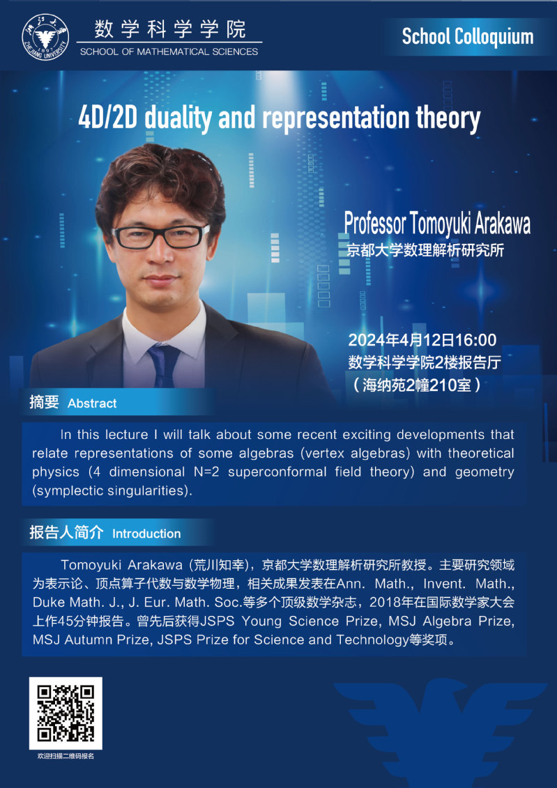 学术科研 学术团队 学术活动 学术会议 学术报告 讨论班 School Colloquium 信息公告 文件汇编 School Colloquium 米兰网页版 > 4D/2D duality and representation theory 来源:米兰(中国) 发布时间:2024-04-07 112