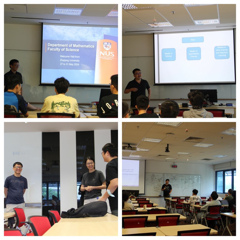 访学期间,同学们参加了由IMS举办的关于高维数据的统计机器学习的学术活动,聆听了世界一流学者的学术报告。同学们还参与了由NUS的SIAM学生分会举办的专题研讨会,来自NUS数学系的教授、博后和博士生们带来了在优化、机器学习、拓扑等不同领域的精彩研究报告,我校交流团中也有三名本科生进行了学术分享,展示了浙大数学学子的风采。