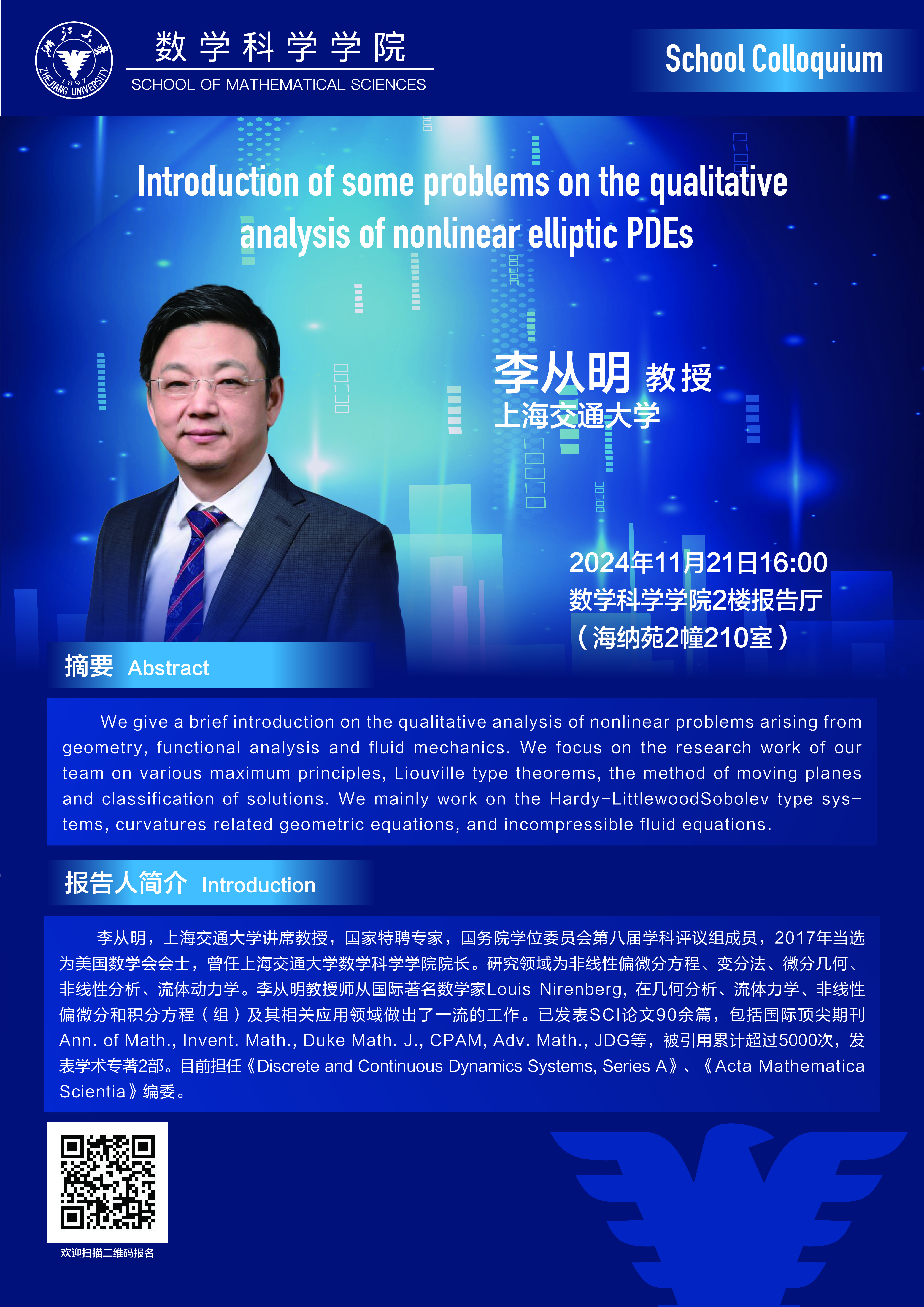 学术科研 学术团队 学术活动 学术会议 学术报告 讨论班 School Colloquium 信息公告 文件汇编 School Colloquium 米兰网页版 > School Colloquium——Introduction of some problems on the qualitative analysis of nonlinear elliptic PDEs 来源:米兰(中国) 发布时间:2024-11-18 245