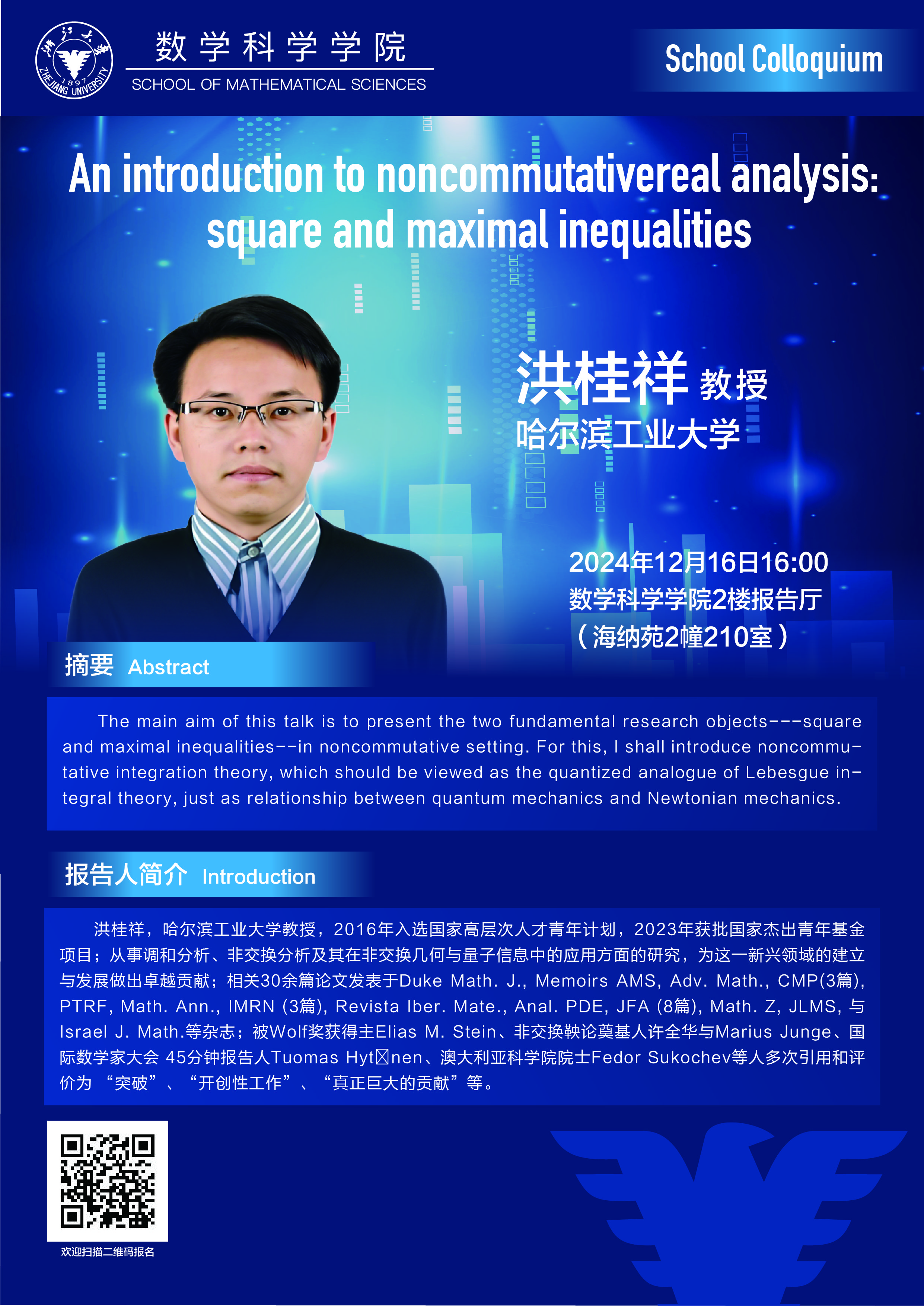 学术科研 学术团队 学术活动 学术会议 学术报告 讨论班 School Colloquium 信息公告 文件汇编 School Colloquium 米兰网页版 > School Colloquium——An introduction to noncommutative real analysis: square and maximal inequalities 来源:米兰(中国) 发布时间:2024-12-10 291
