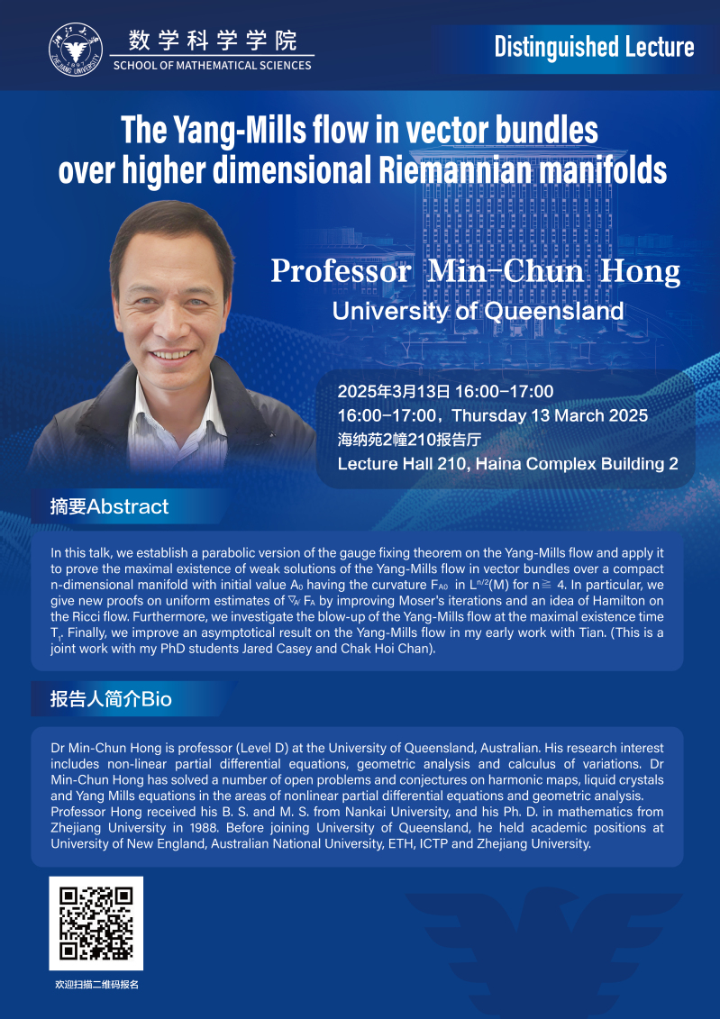 学术科研 学术团队 学术活动 学术会议 学术报告 讨论班 School Colloquium 信息公告 文件汇编 School Colloquium 米兰网页版 > Distinguished Lecture——The Yang-Mills flow in vector bundles over higher dimensional Riemannian manifolds 来源:米兰(中国) 发布时间:2025-03-10 219