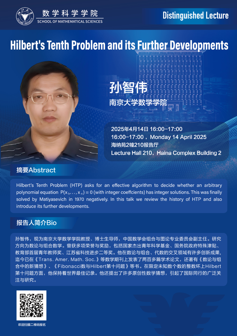 学术科研 学术团队 学术活动 学术会议 学术报告 讨论班 School Colloquium 信息公告 文件汇编 School Colloquium 米兰网页版 > Distinguished Lecture——Hilbert's Tenth Problem and its Further Developments 来源:米兰(中国) 发布时间:2025-04-08 23