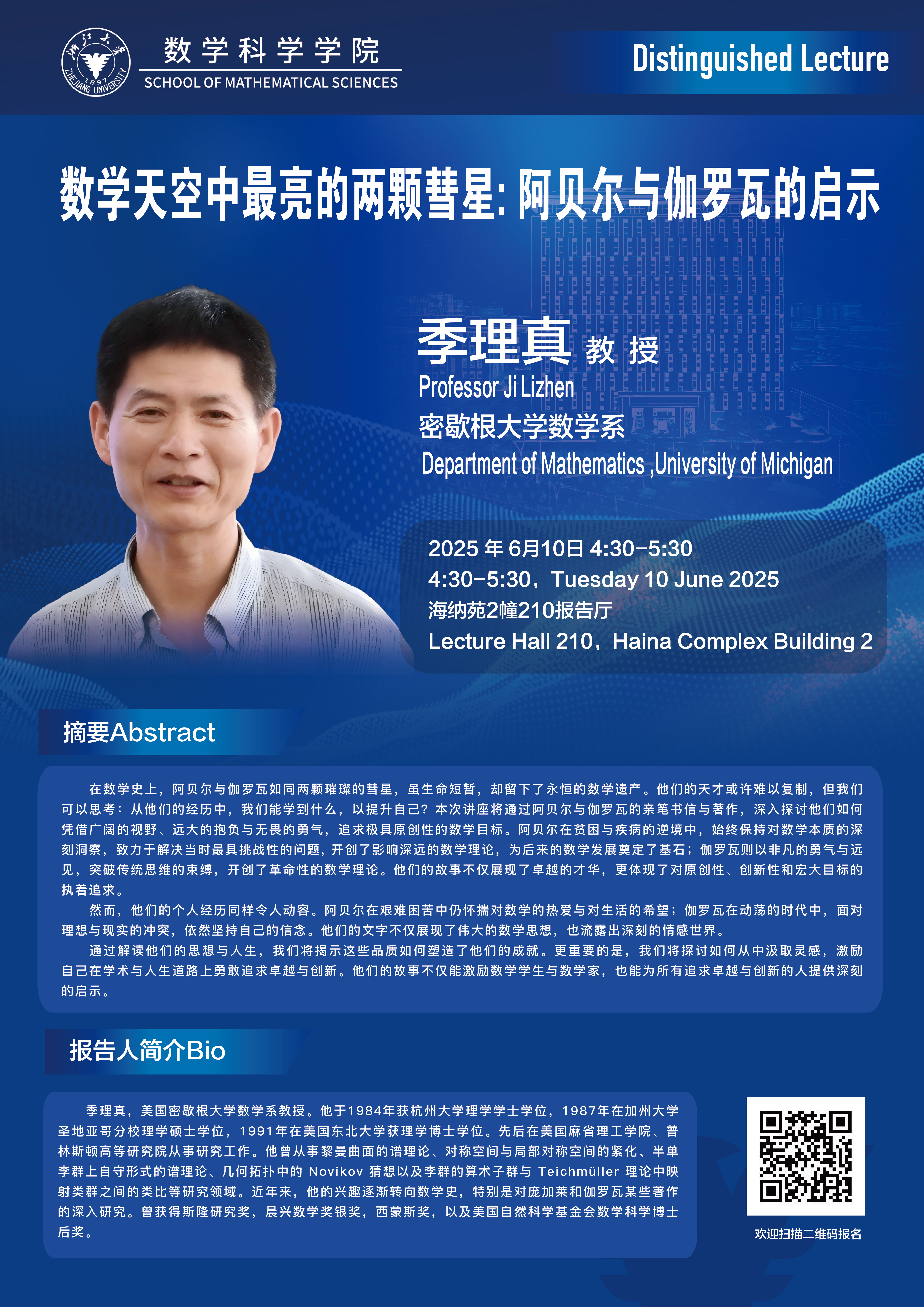 学术科研 学术团队 学术活动 学术会议 学术报告 讨论班 School Colloquium 信息公告 文件汇编 School Colloquium 米兰网页版 > Distinguished Lecture——数学天空中最亮的两颗彗星: 阿⻉尔与伽罗⽡的启示 来源:米兰(中国) 发布时间:2025-06-07 21