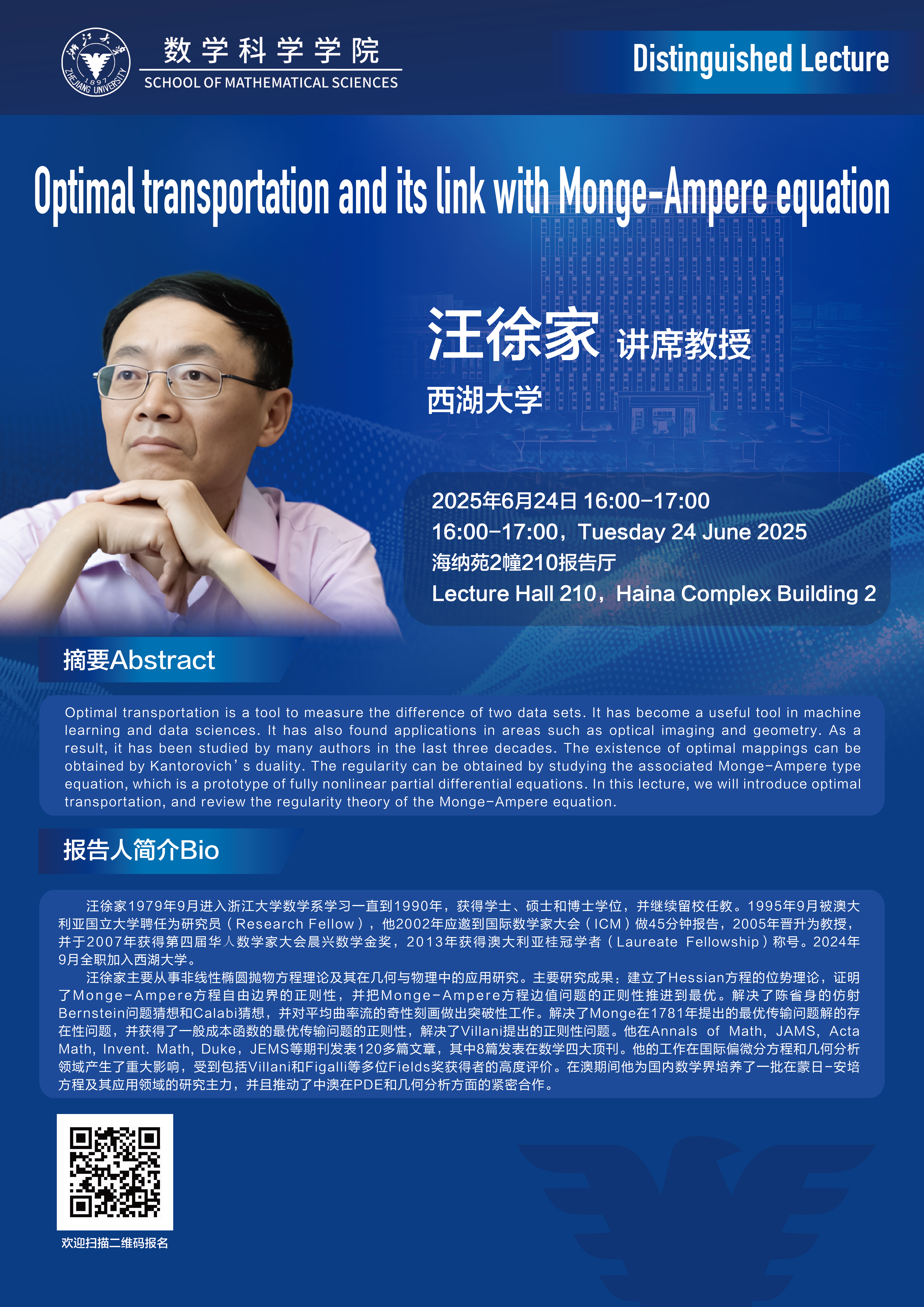 学术科研 学术团队 学术活动 学术会议 学术报告 讨论班 School Colloquium 信息公告 文件汇编 School Colloquium 米兰网页版 > Distinguished Lecture——Optimal transportation and its link with Monge-Ampere equation 来源:米兰(中国) 发布时间:2025-06-19 22